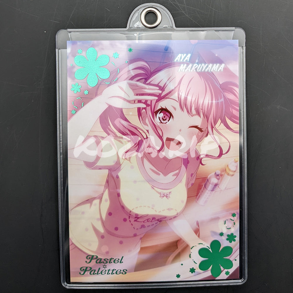 Bromide featuring Aya Maruyama from BanG Dream! Girls Band Party! The cover features Pastel*Palettes stamping and a keychain hole. Includes ball chain.