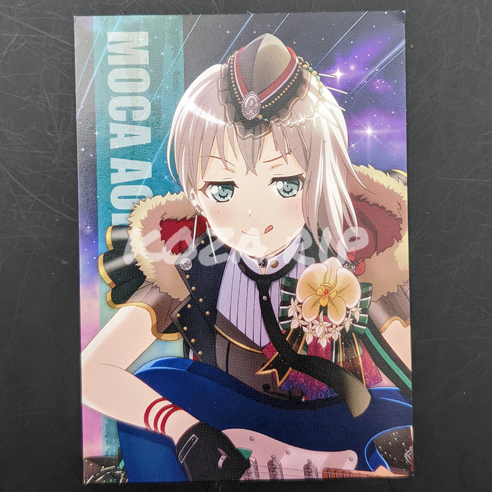 Trading card featuring Moca Aoba from BanG Dream! Girls Band Party! This trading card was a first press extra included with Afterglow's 3rd CD Single, "Tsunagu, Soramoyou".